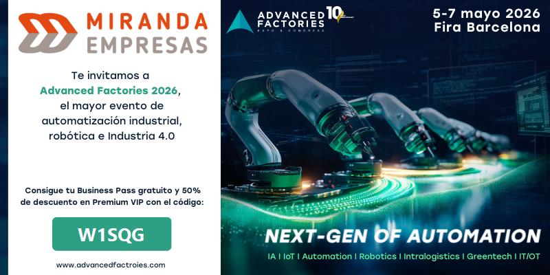 Gracias al acuerdo de colaboración entre Miranda Empresas y Advanced Factories 2026, te ofrecemos una invitación BUSSINESS PASS gratuita. Para ello, introduce el código de descuento W1SQG aquí, selecciona el pase deseado, haz click en continuar e introduce tus datos para completar el registro.