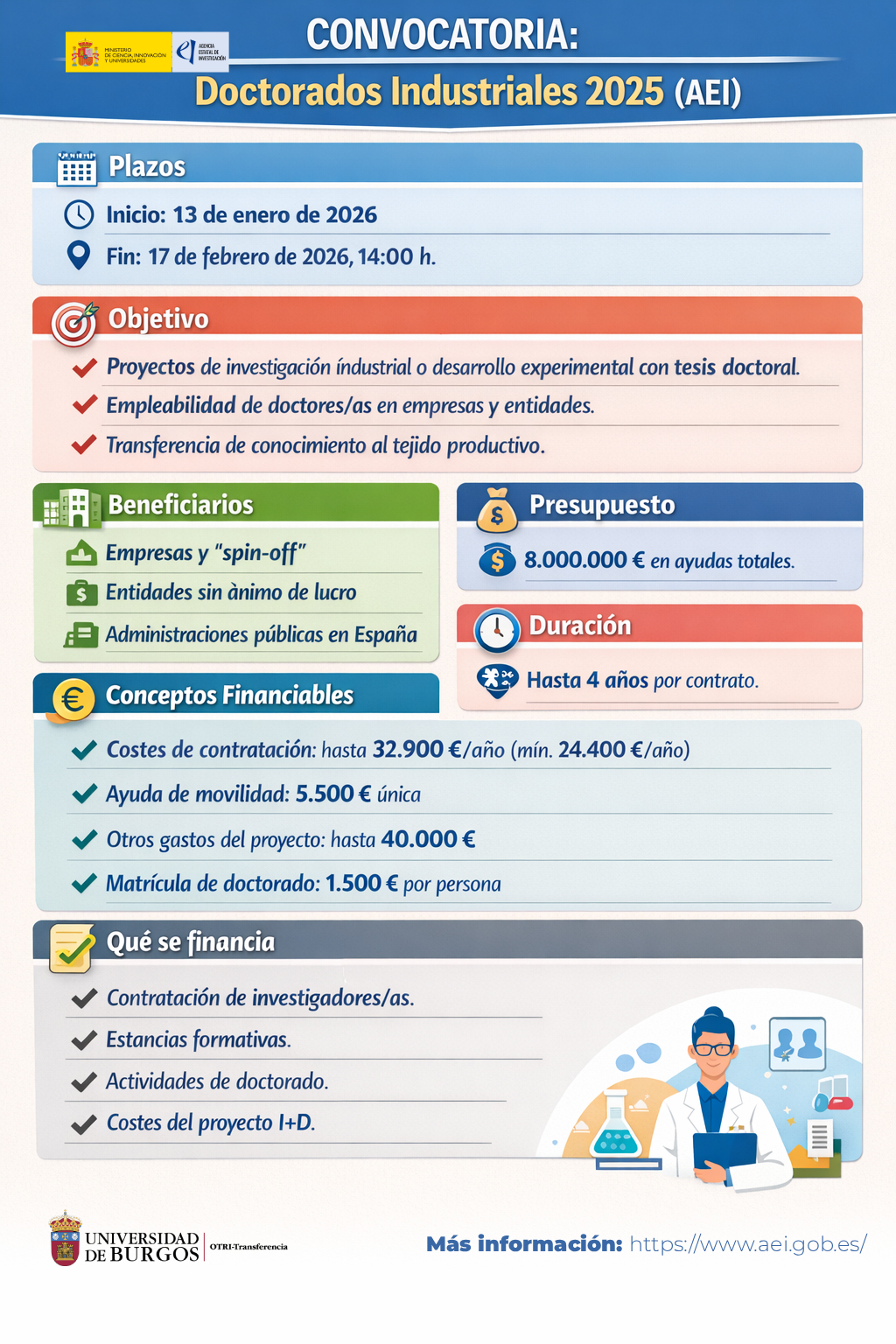 La Universidad de Burgos nos traslada la convocatoria de Ayudas para contratos para la formación de doctores y doctoras en empresas y otras entidades (Doctorados Industriales) 2025, impulsada por la Agencia Estatal de Investigación.