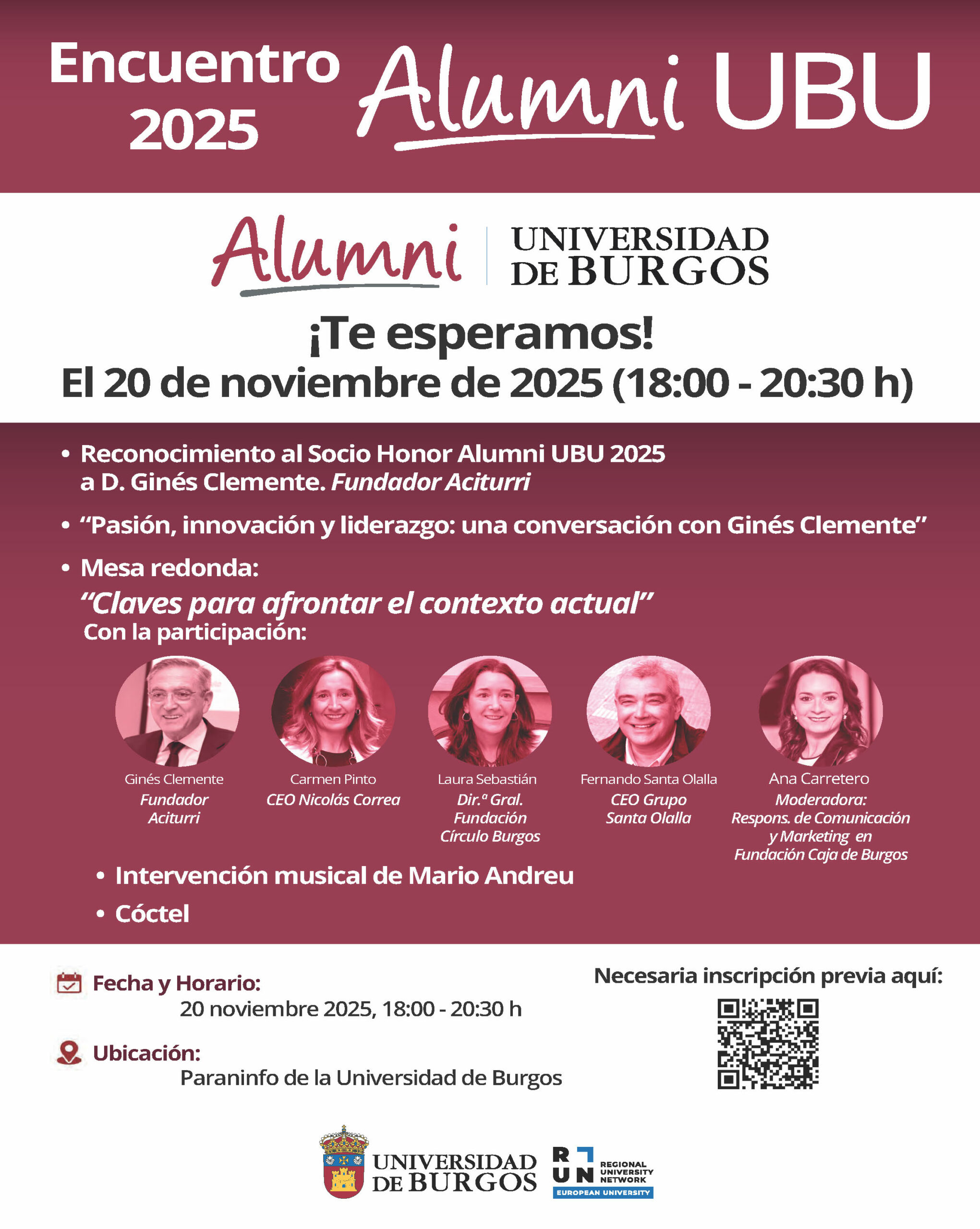 Destinado a egresados, docentes, investigadores y personal técnico de la Universidad de Burgos, y abierto a personas comprometidas con la UBU, el objetivo de este encuentro es crear comunidad e impulsar sinergias, oportunidades y relaciones de valor entre los Alumni UBU.